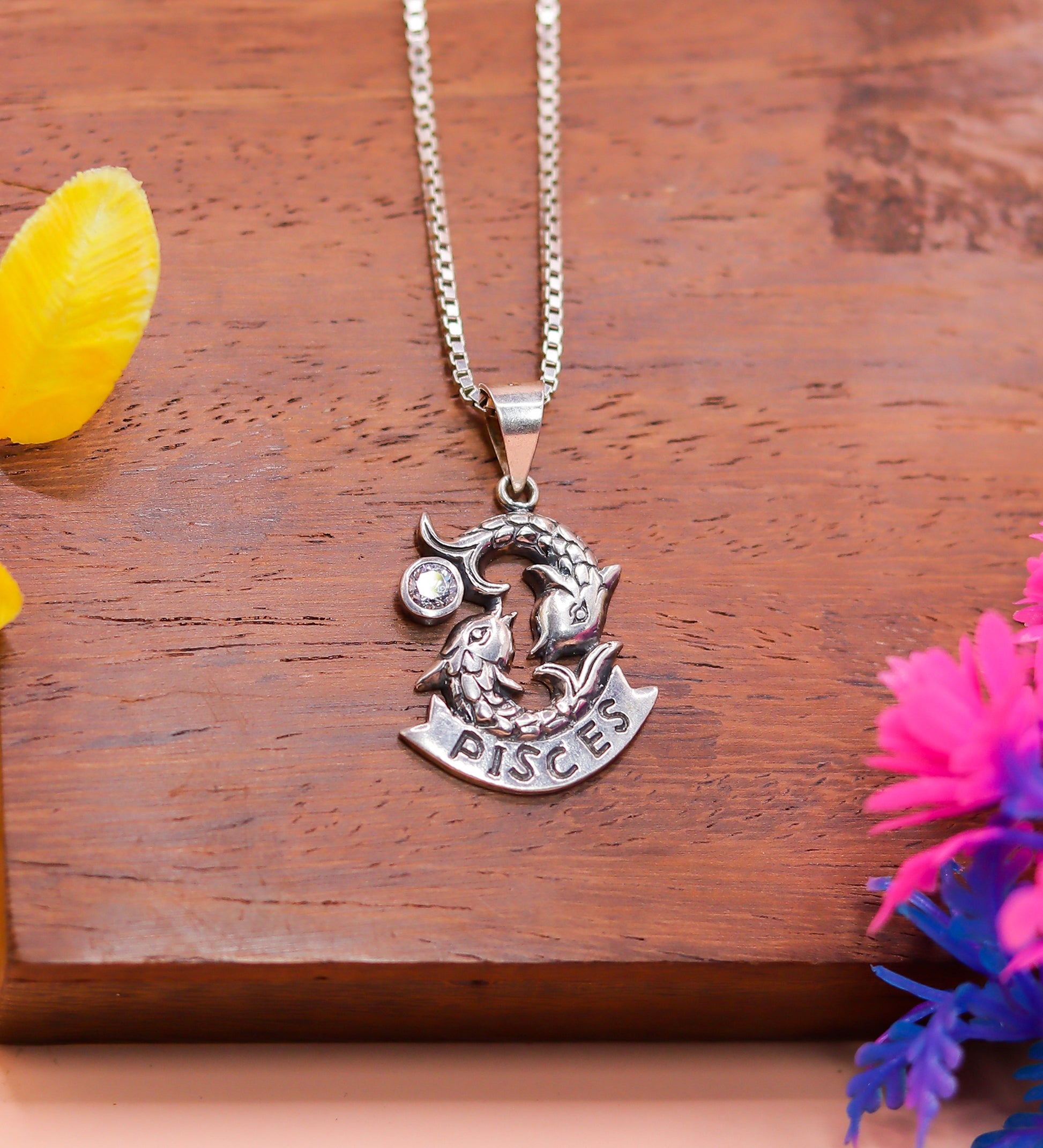 This elegant Pisces zodiac pendant is crafted from premium 925 sterling silver, featuring a beautifully detailed twin fish design that represents the Pisces symbol. A subtle sparkling stone accent adds a refined touch, enhancing the pendant’s character and shine.