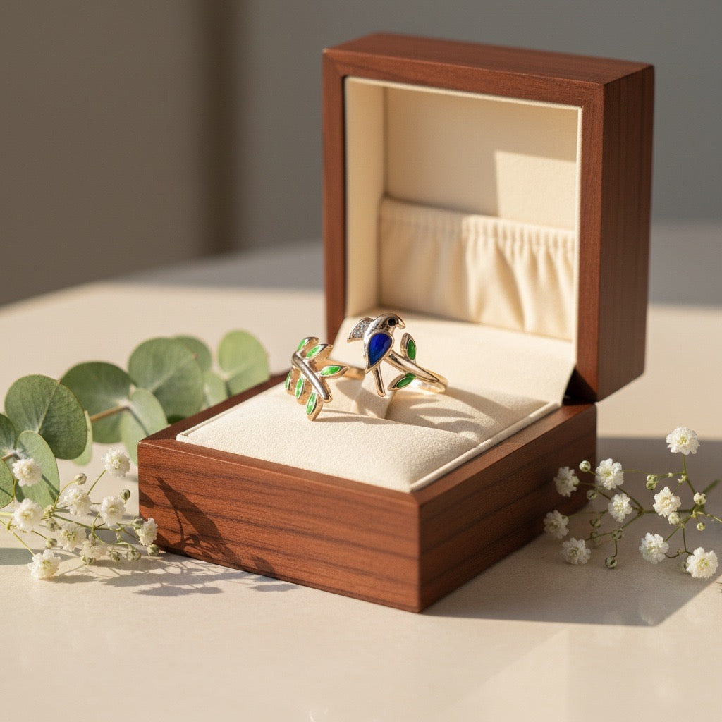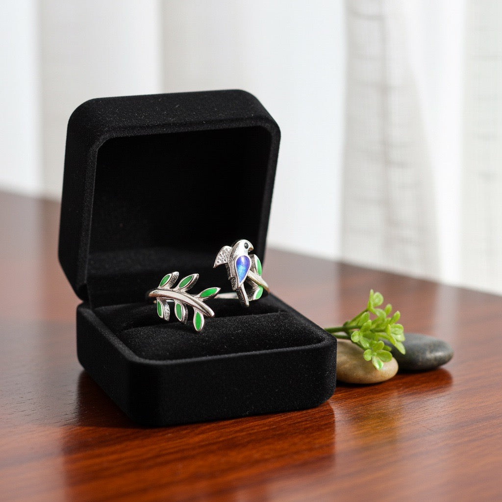 The Enchanted Bird & Leaf Silver Ring is a beautifully crafted piece inspired by nature’s serenity. Featuring a delicate bird perched on a leafy branch, this ring showcases vibrant enamel accents in green and blue that bring the design to life. Its open, adjustable style offers both comfort and elegance, making it a perfect everyday statement ring.