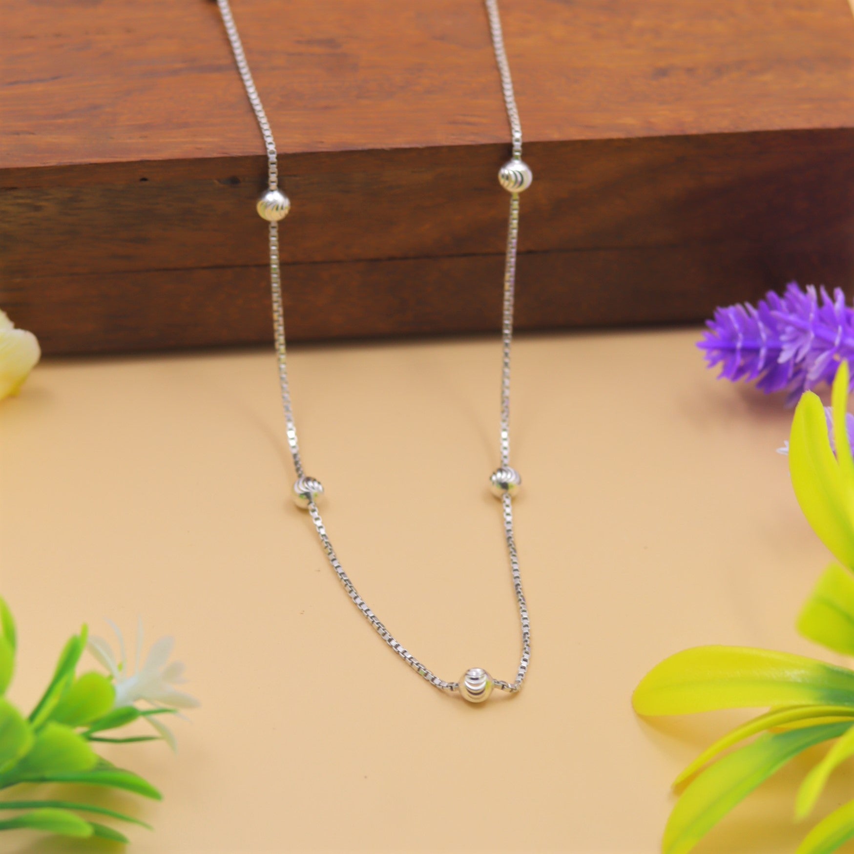 This stylish silver chain is designed with delicate round beads placed at balanced intervals, giving it a clean and elegant look. The lightweight finish makes it comfortable for daily wear, while the subtle shine adds a premium touch. Perfect to wear alone for a minimal style or layered with pendants for a modern look. Suitable for both casual and festive outfits.