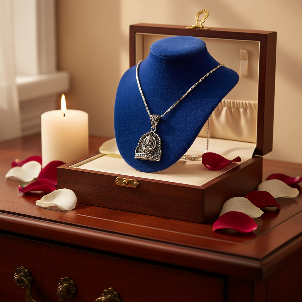 A beautifully crafted oxidised silver pendant featuring an intricate Lord Ganesha design. The antique detailing and traditional finish give it a spiritual yet stylish look, perfect for everyday wear or festive occasions. Lightweight, durable, and meaningful—this pendant is an ideal choice for those who love devotional jewellery with a touch of ethnic elegance.