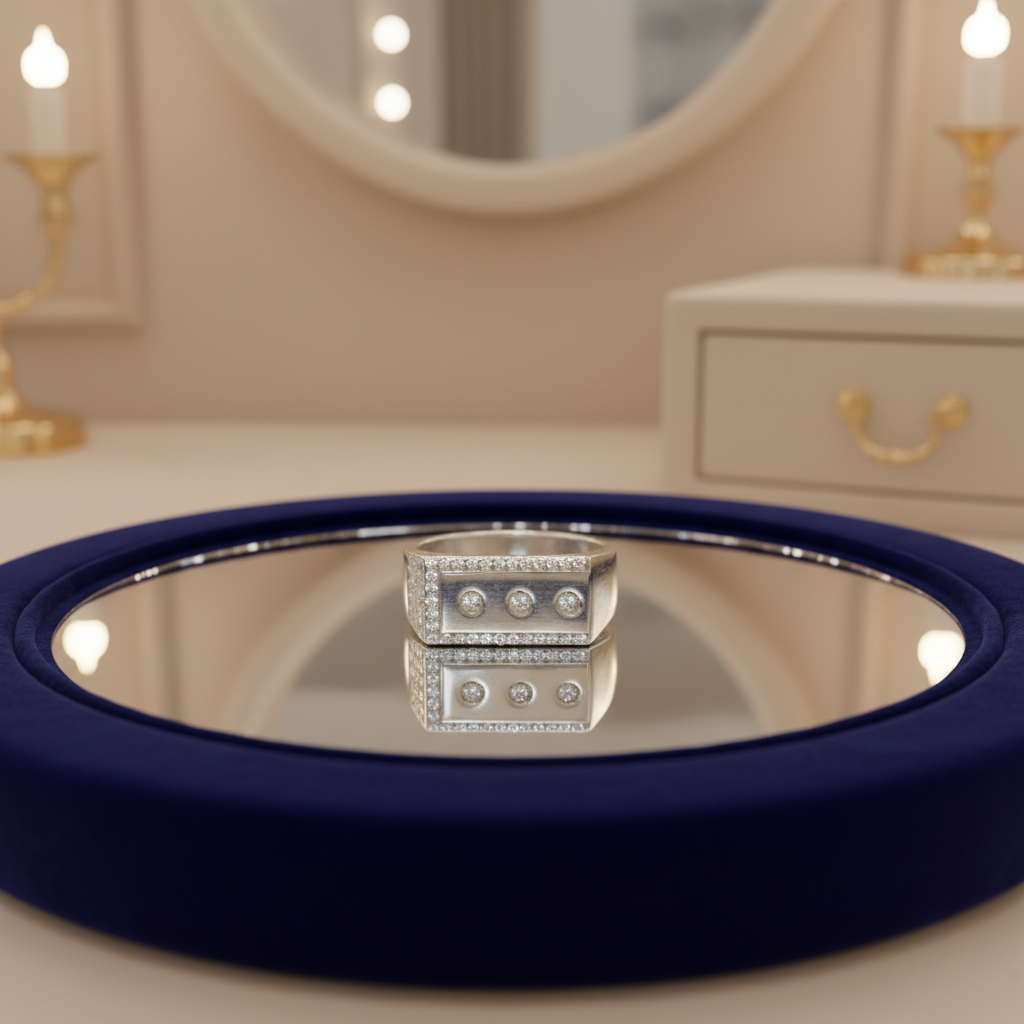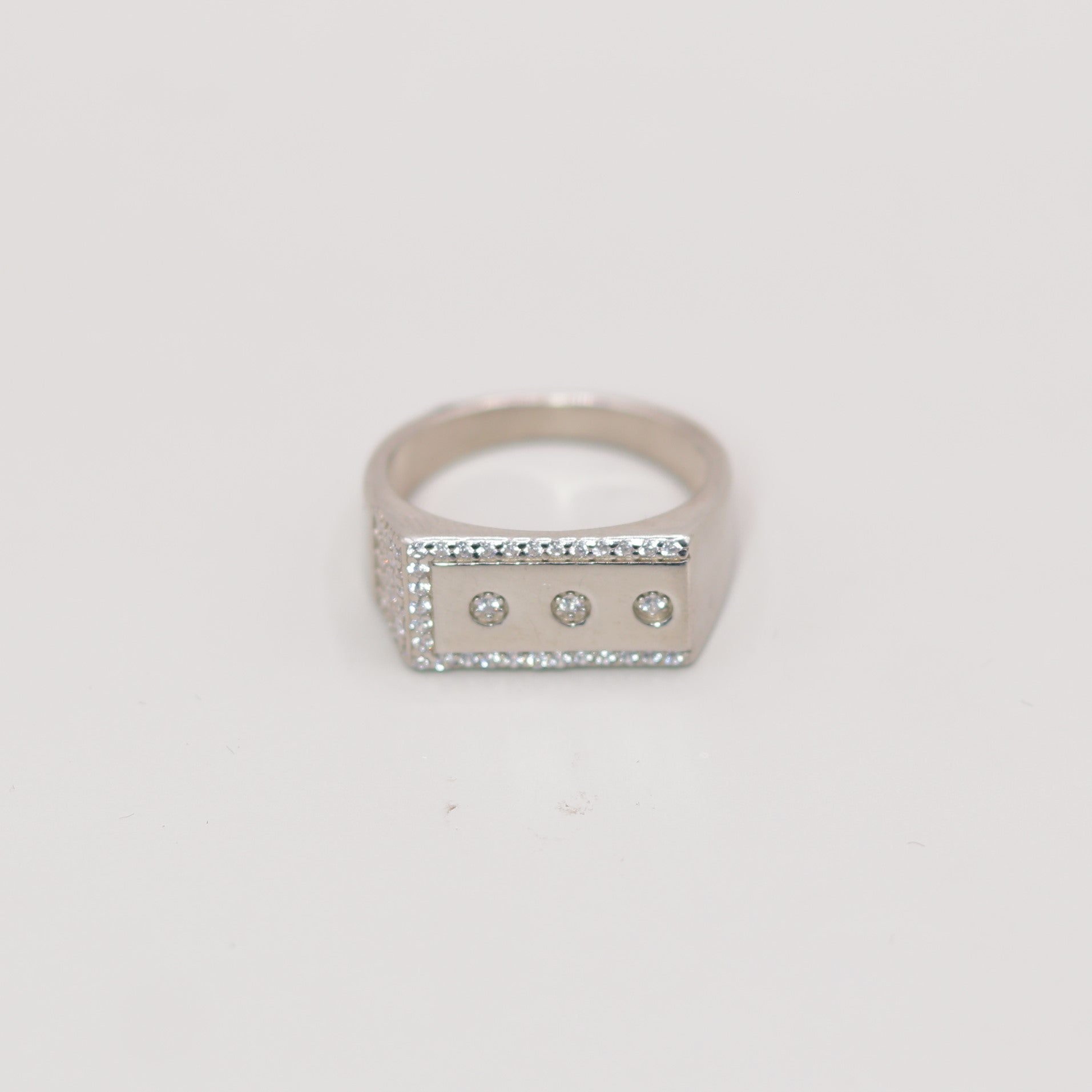 This premium silver ring features a bold rectangular face adorned with three sparkling stones, giving it a modern and sophisticated appeal. The side rows of micro-studded detailing enhance its brilliance, making it an ideal choice for men who prefer a classy yet powerful jewellery style. Perfect for weddings, parties, or daily premium wear, this ring delivers durability, shine, and a rich designer look.