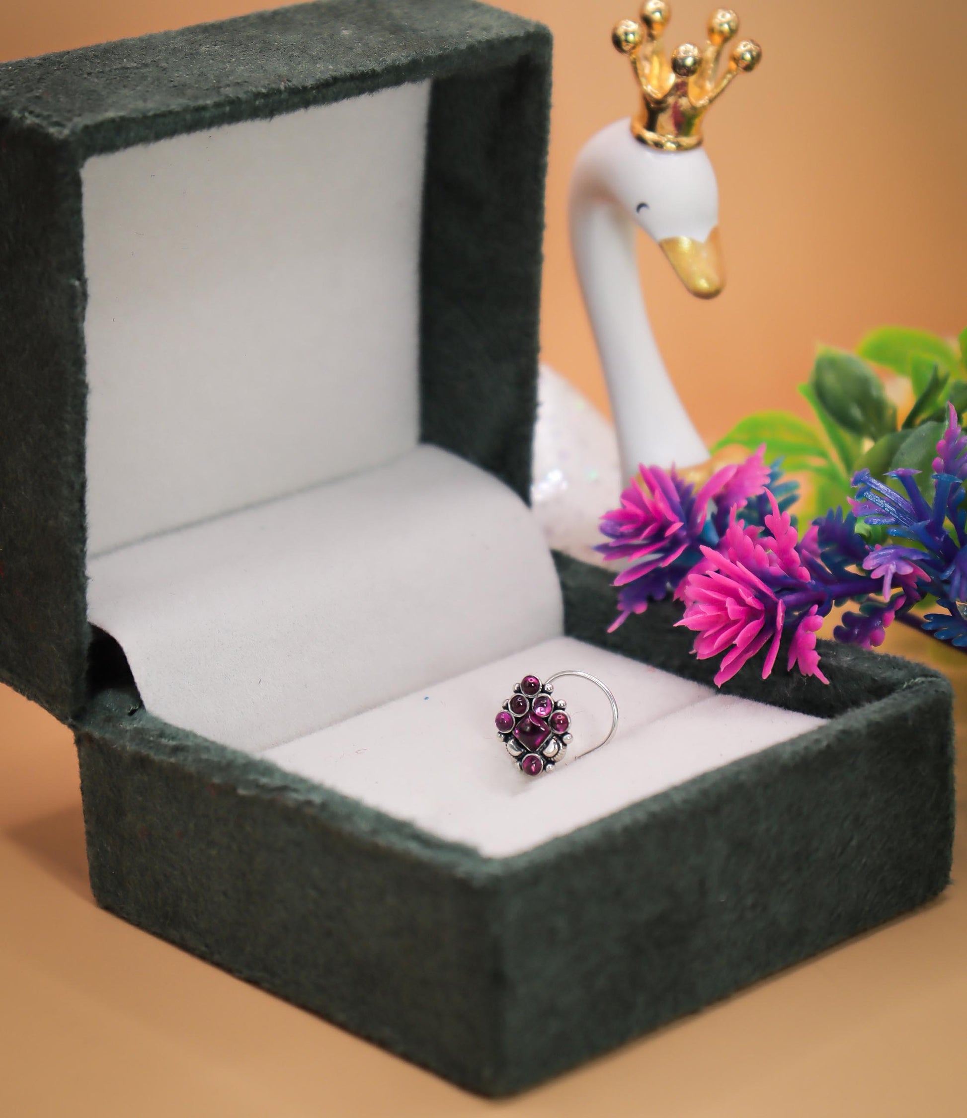The Royal Bloom Silver Nose Pin is a handcrafted masterpiece in 92.5 sterling silver, featuring a central square-cut purple stone encircled by multiple round purple accents. The oxidized silver beadwork enhances its regal and antique charm, making it a perfect choice for women who love bold traditional jewelry. The deep purple stones symbolize royalty, wisdom, and creativity, making this nose pin an elegant highlight for festivals, weddings, and cultural occasions.